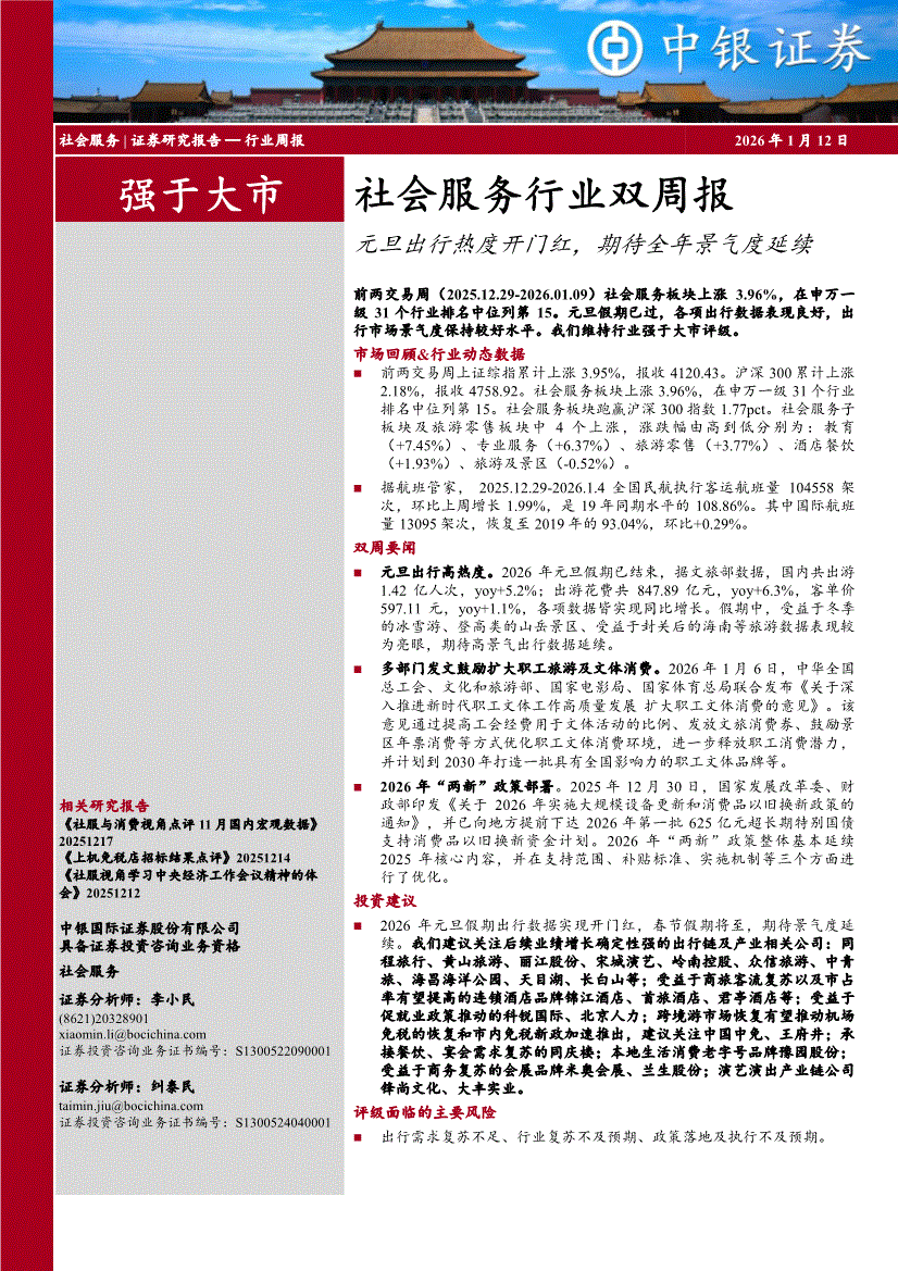 社会服务行业:中银国际-社会服务行业双周报:元旦出行热度开门红,期待全年景气度延续-260112