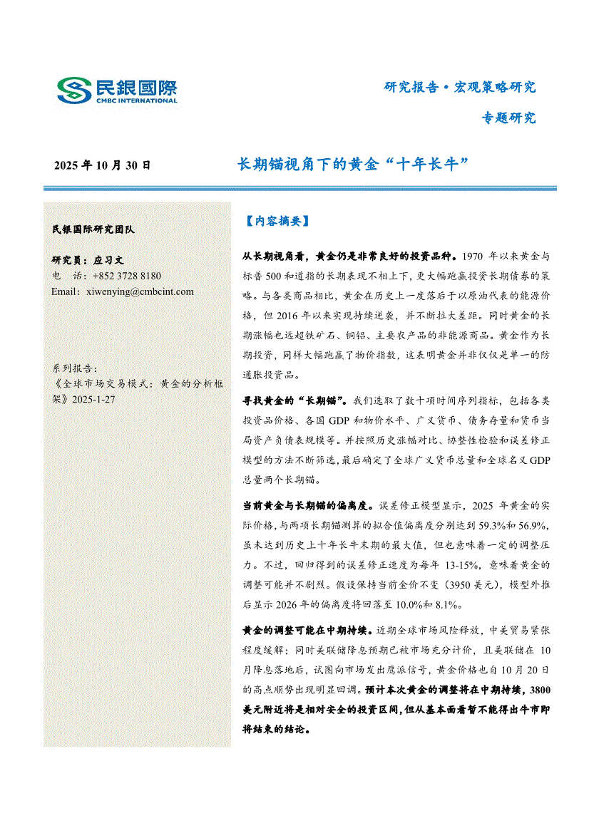 民银国际-长期锚视角下的黄金“十年长牛”-251030