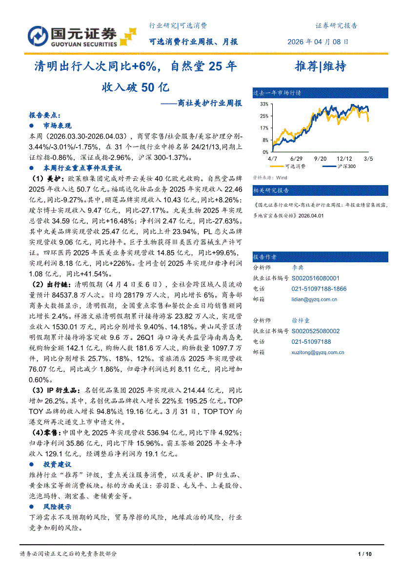 商社美护行业:国元证券-商社美护行业周报:清明出行人次同比+6%,自然堂25年收入破50亿-260408