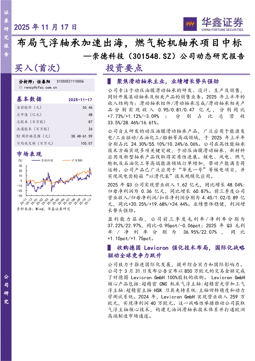 崇德科技:华鑫证券-崇德科技-301548-公司动态研究报告:布局气浮轴承加速出海,燃气轮机轴承项目中标-251117