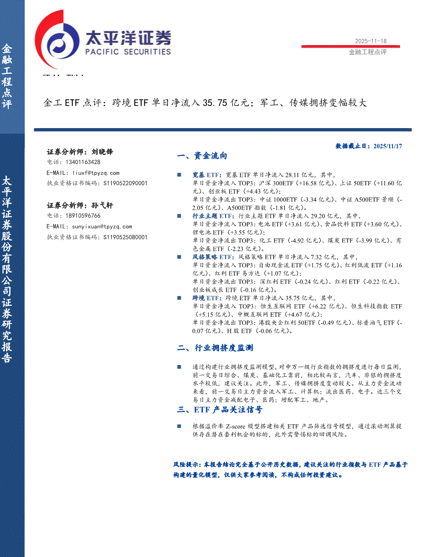 太平洋证券-金工ETF点评:跨境ETF单日净流入35.75亿元;军工、传媒拥挤变幅较大-251118