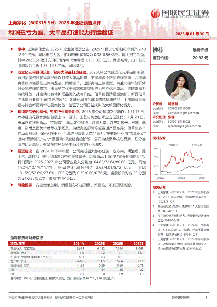 上海家化:国联民生证券-上海家化-600315-2025年业绩预告点评:利润扭亏为盈,大单品打造能力持续验证-260130
