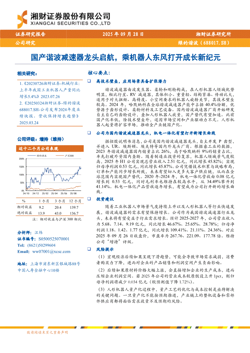 绿的谐波:湘财证券-绿的谐波-688017-国产谐波减速器龙头启航,乘机器人东风打开成长新纪元-250928