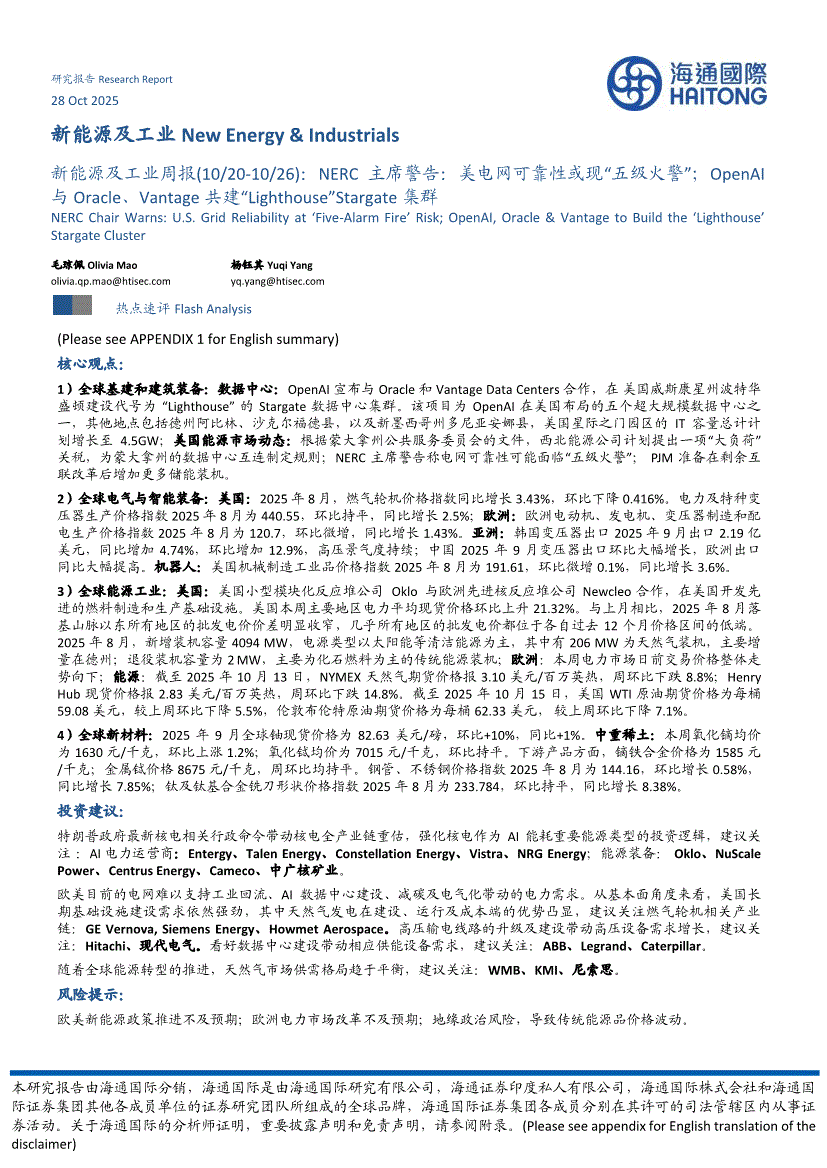新能源及工业行业:海通国际-新能源及工业行业周报:NERC主席警告,美电网可靠性或现“五级火警”;OpenAI与Oracle、Vantage共建“Lighthouse”Stargate集群-251028