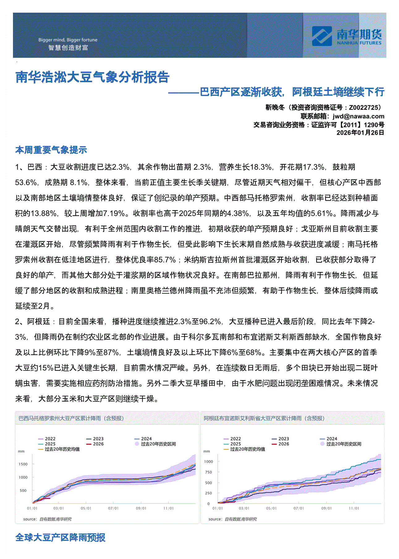 南华期货-浩淞大豆气象分析报告:巴西产区部分收获,阿根廷降雨偏少-260112