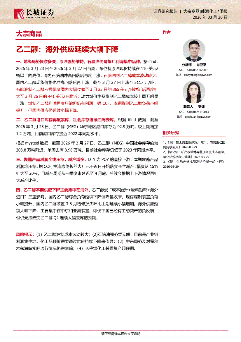 长城证券-大宗商品:乙二醇,海外供应延续大幅下降-260330