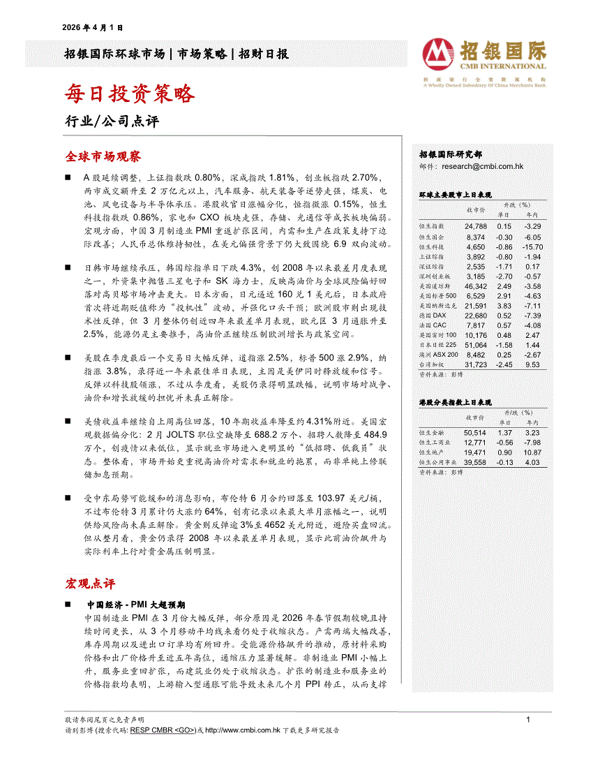 招银国际-招财日报:每日投资策略-260401