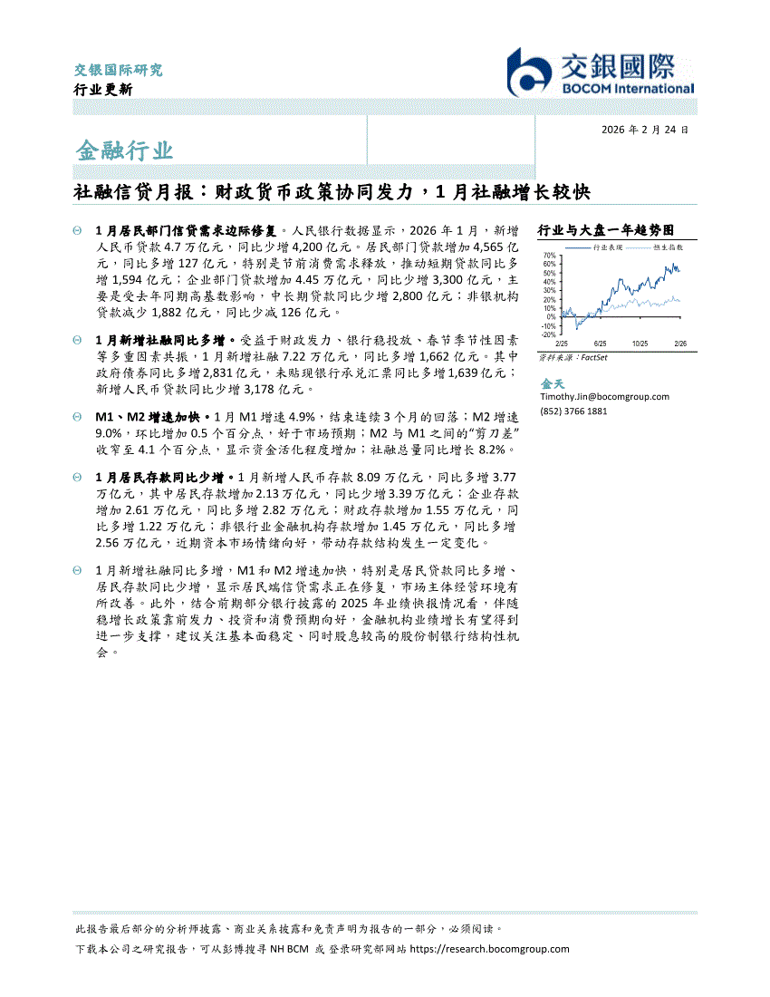 金融行业:交银国际-金融行业社融信贷月报:财政货币政策协同发力,1月社融增长较快-260224