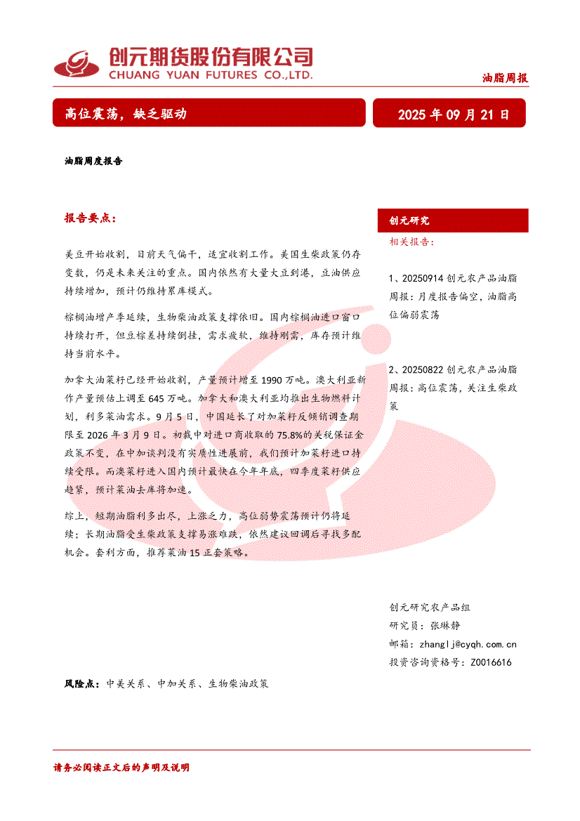 创元期货-油脂周度报告:高位震荡,缺乏驱动-250921