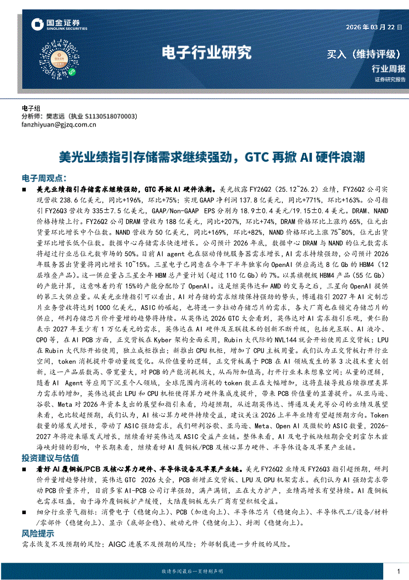 电子行业:国金证券-电子行业周报:美光业绩指引存储需求继续强劲,GTC再掀AI硬件浪潮-260322
