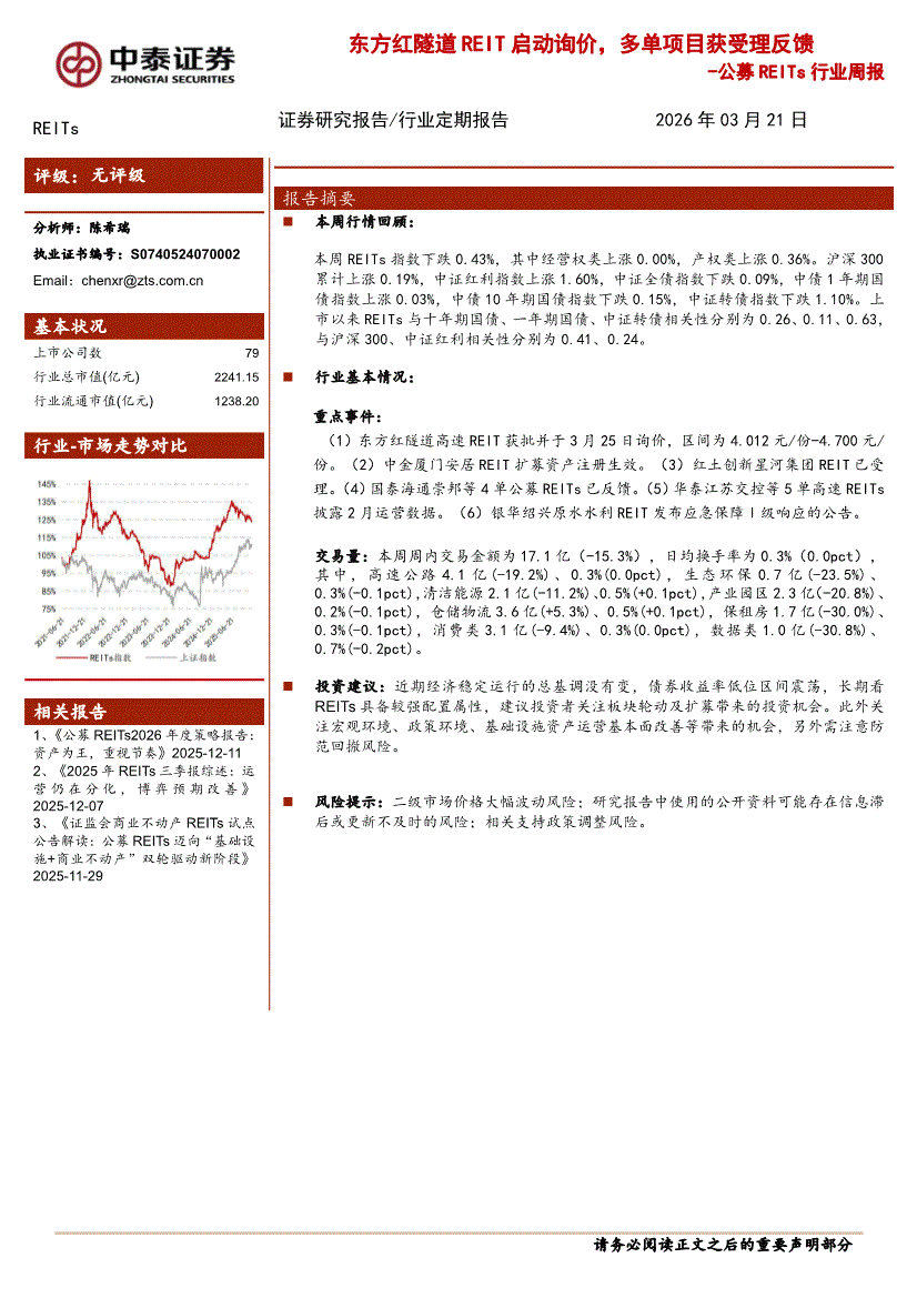 REITs行业:中泰证券-公募REITs行业周报:东方红隧道REIT启动询价,多单项目获受理反馈-260321