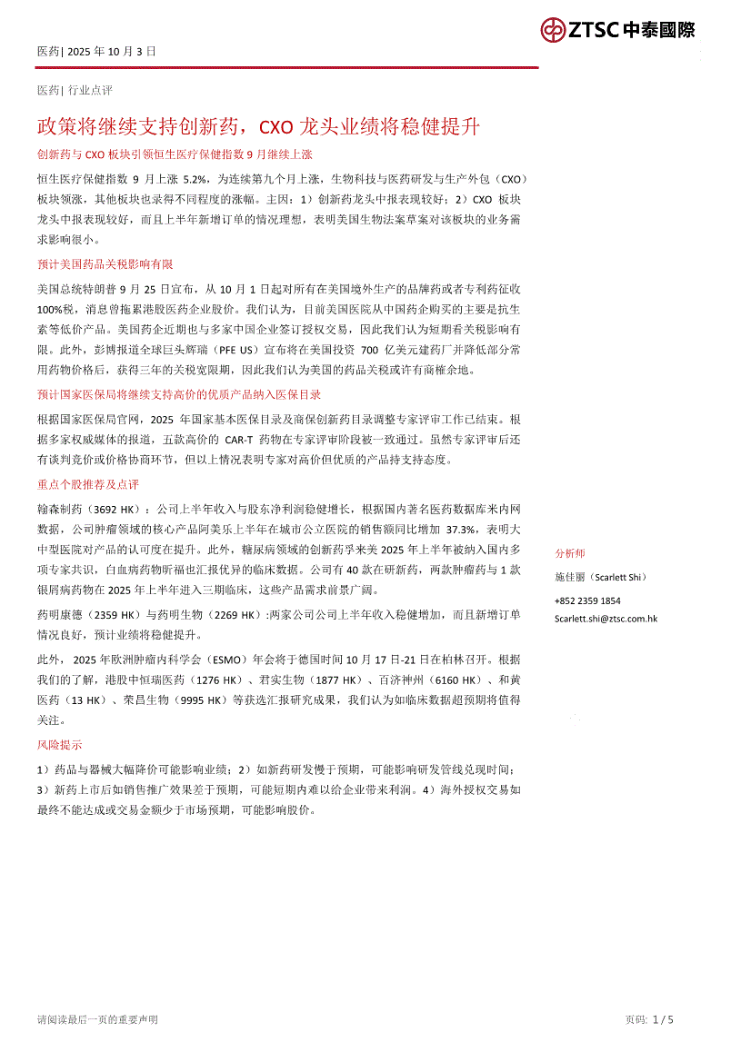 医药行业:中泰国际-医药行业点评:政策将继续支持创新药,CXO龙头业绩将稳健提升-251003
