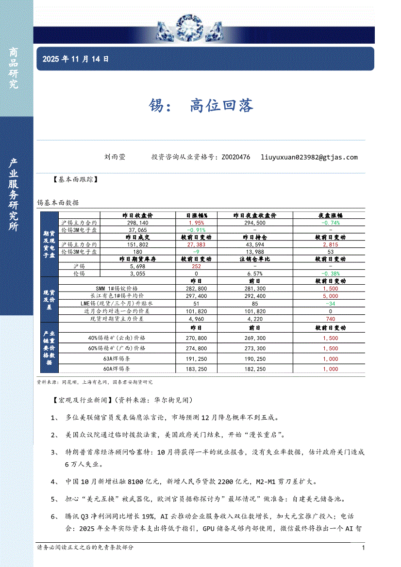 国泰君安期货-锡:高位回落-251114
