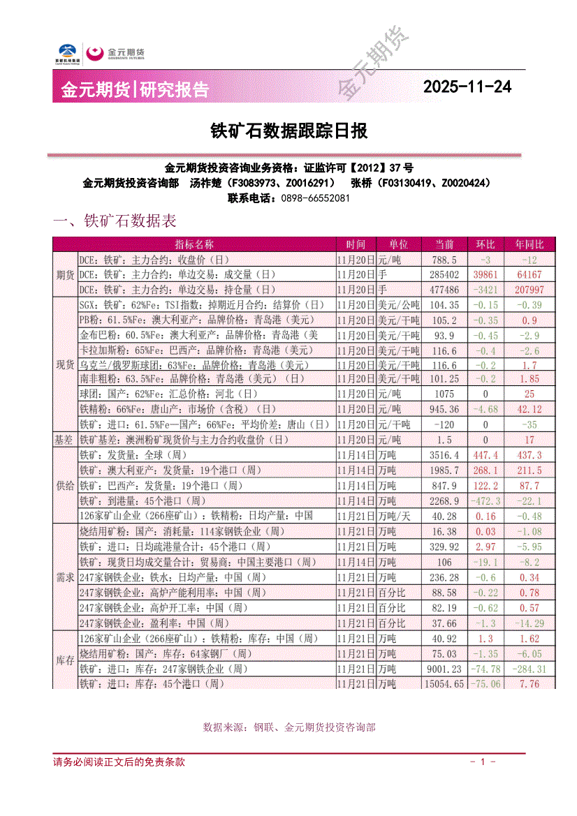 金元期货-铁矿石数据跟踪日报-251124