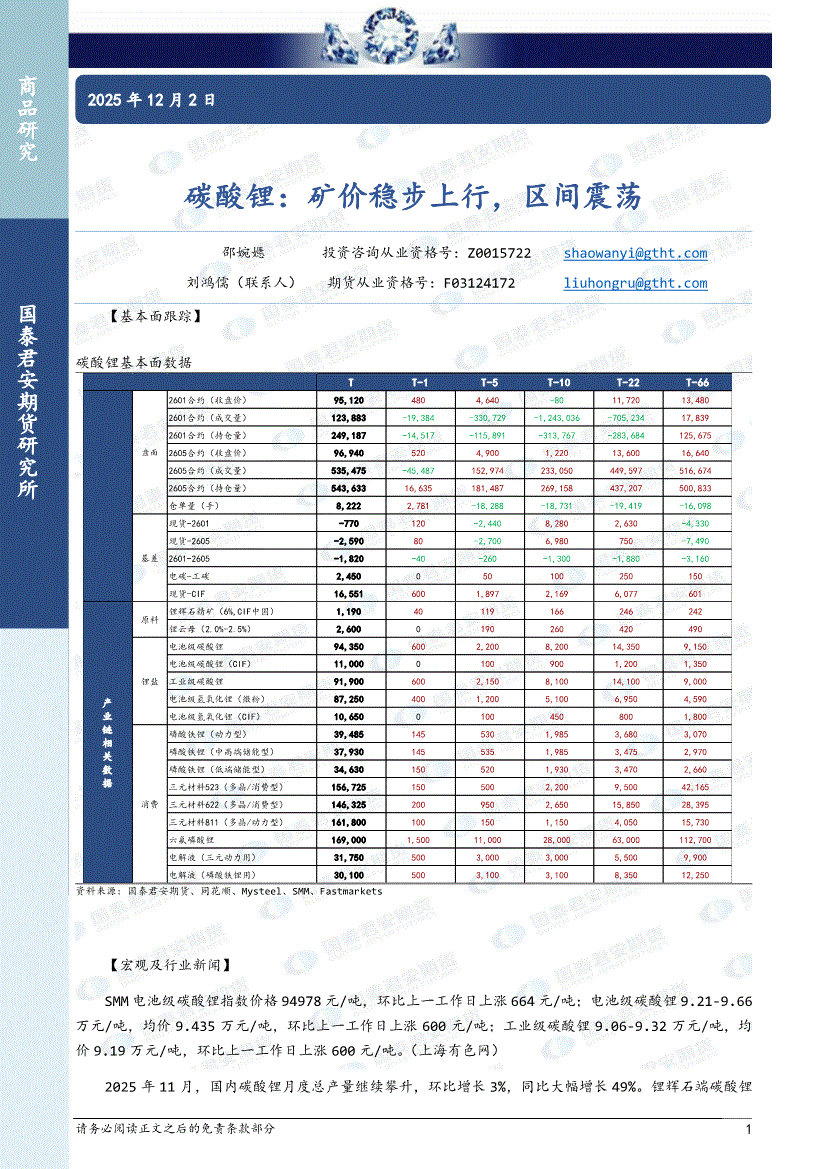 国泰君安期货-碳酸锂:矿价稳步上行,区间震荡-251202