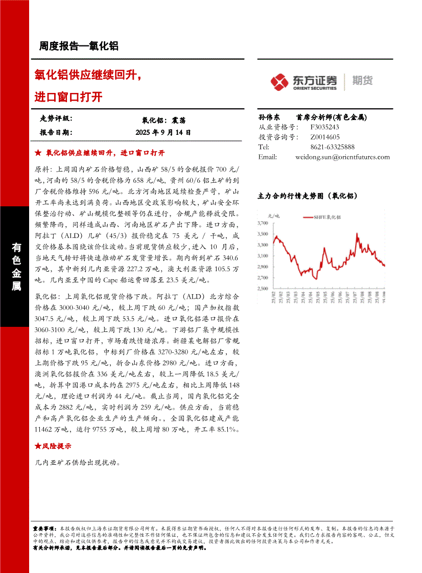 东证期货-氧化铝周度报告:氧化铝供应继续回升,进口窗口打开-250914