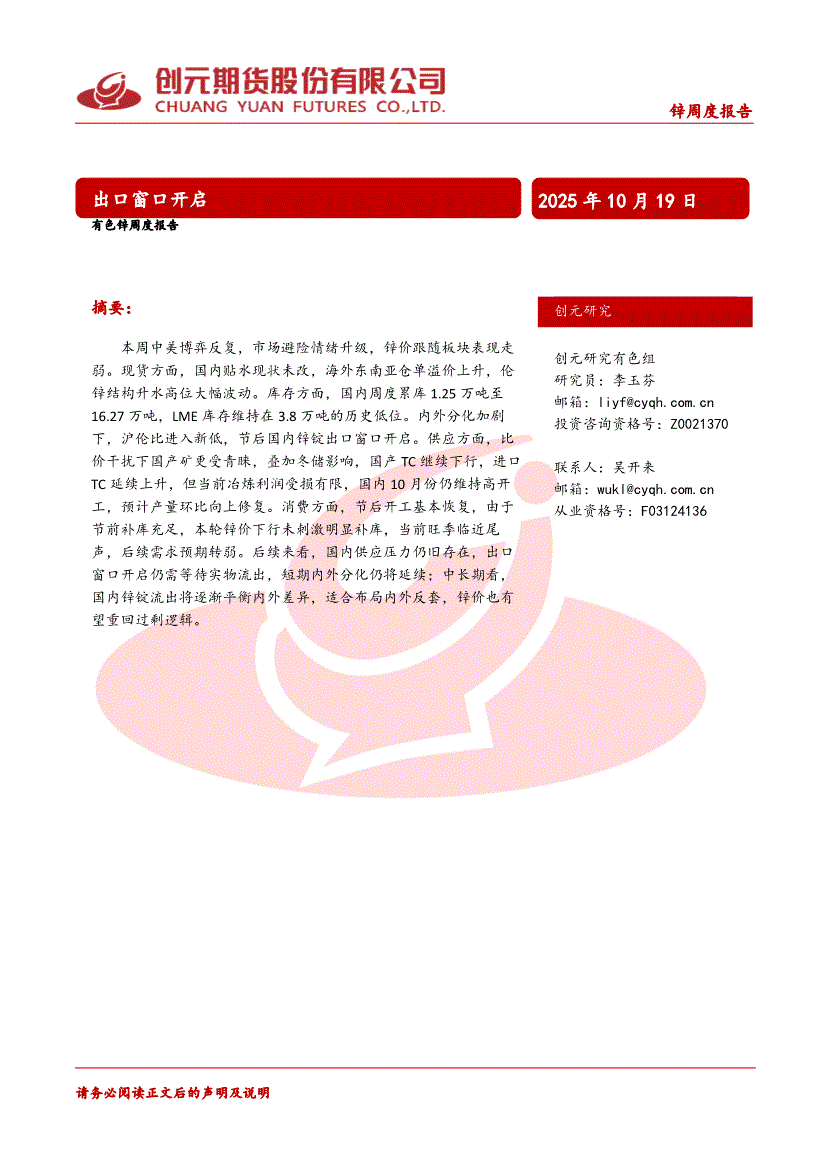 创元期货-有色锌周度报告:出口窗口开启-251019