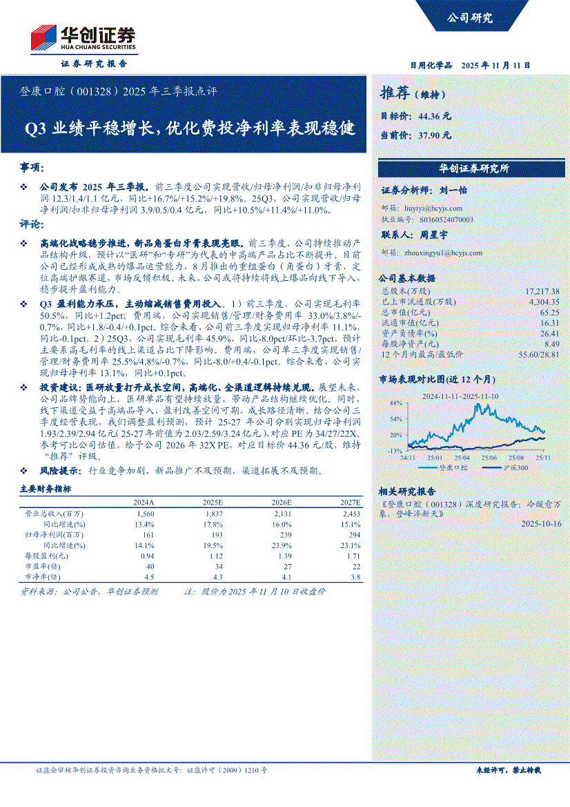 登康口腔:华创证券-登康口腔-001328-2025年三季报点评:Q3业绩平稳增长,优化费投净利率表现稳健-251111