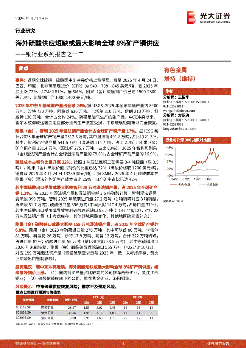 铜行业:光大证券-铜行业系列报告之十二:海外硫酸供应短缺或最大影响全球8%矿产铜供应-260429