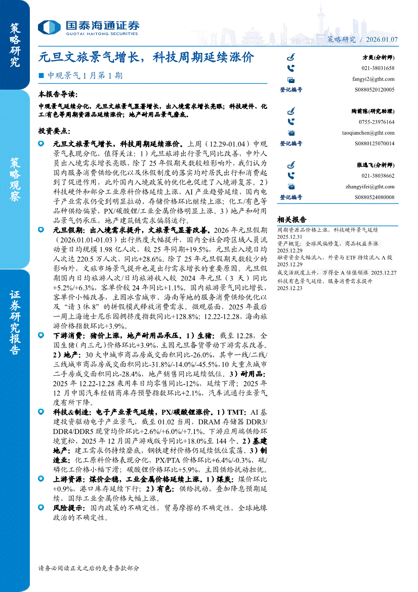 国泰海通证券-中观景气1月第1期:元旦文旅景气增长,科技周期延续涨价-260107