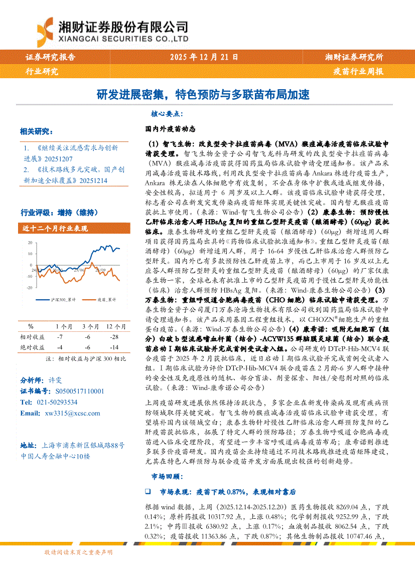 疫苗行业:湘财证券-疫苗行业周报:研发进展密集,特色预防与多联苗布局加速-251221