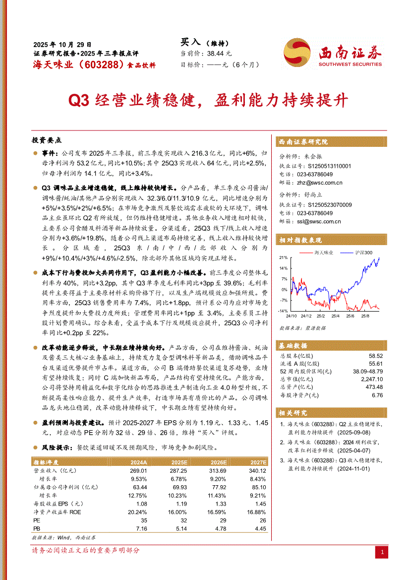 海天味业:西南证券-海天味业-603288-Q3经营业绩稳健,盈利能力持续提升-251029