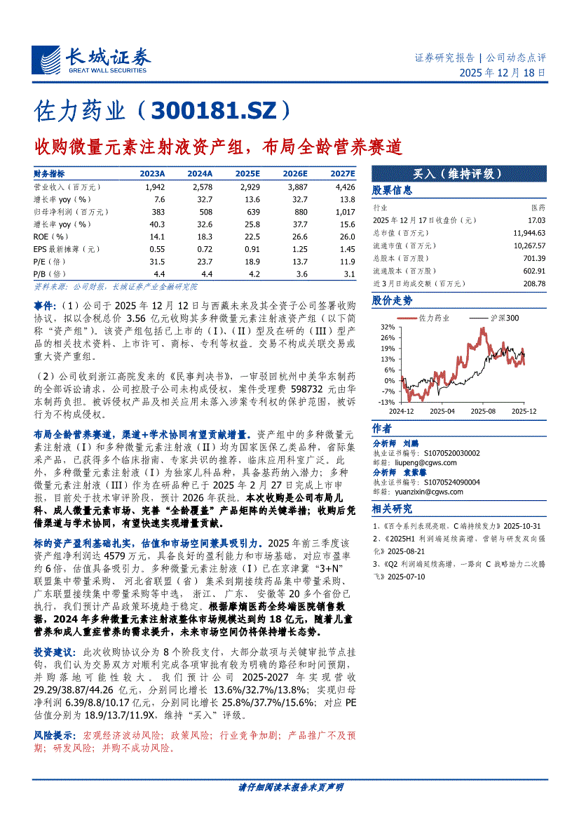 佐力药业:长城证券-佐力药业-300181-收购微量元素注射液资产组,布局全龄营养赛道-251218