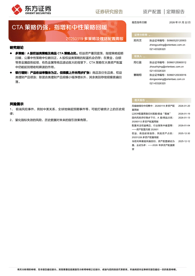 东方证券-20260119多策略及理财配置周报:CTA策略仍强,指增和中性策略回暖-260122