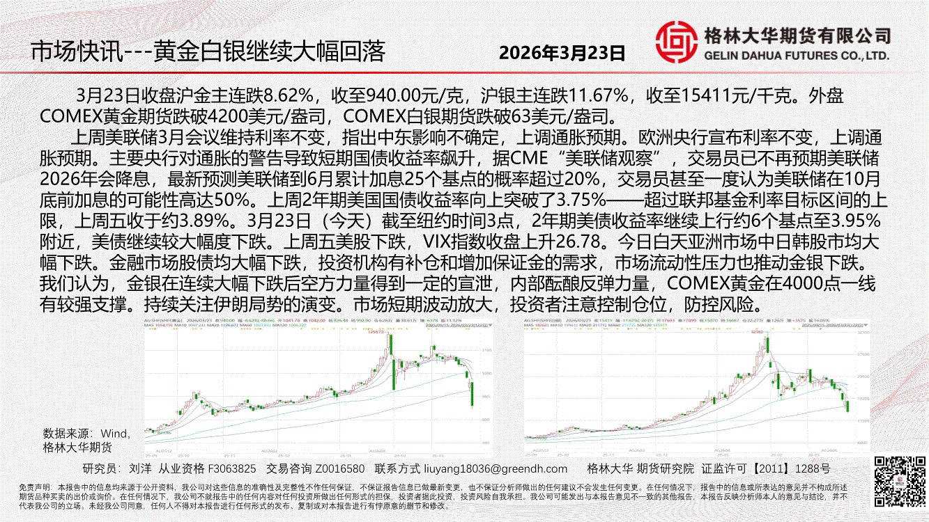 格林大华期货-市场快讯:黄金白银继续大幅回落-260323