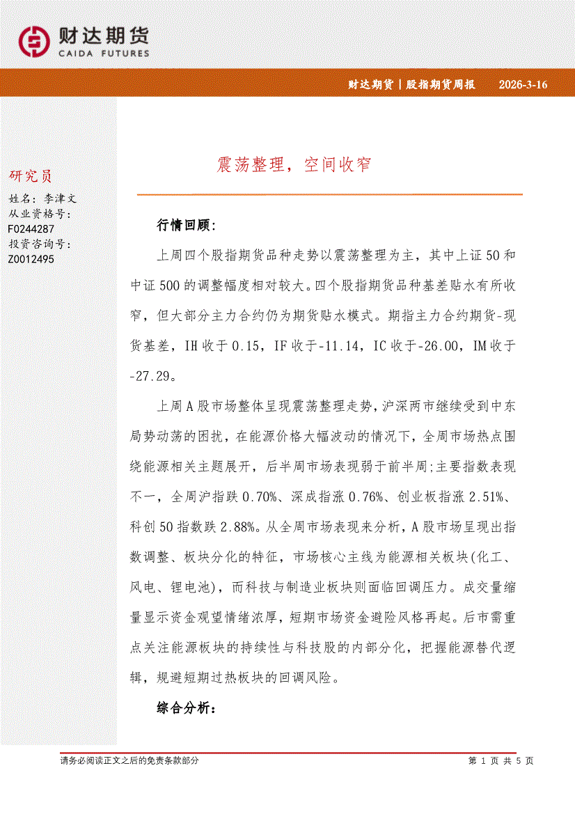 财达期货-股指期货周报:震荡整理,空间收窄-260316