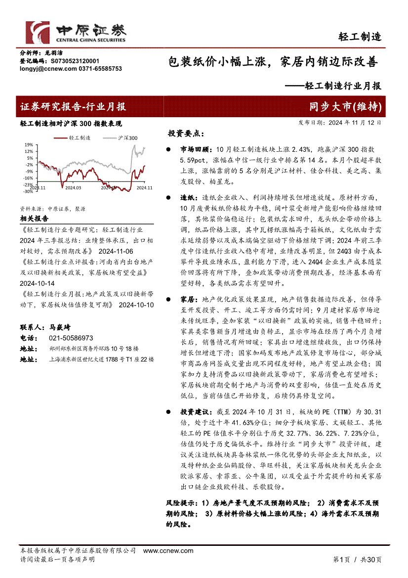轻工制造行业:中原证券-轻工制造行业月报:包装纸价小幅上涨,家居内销边际改善-241112