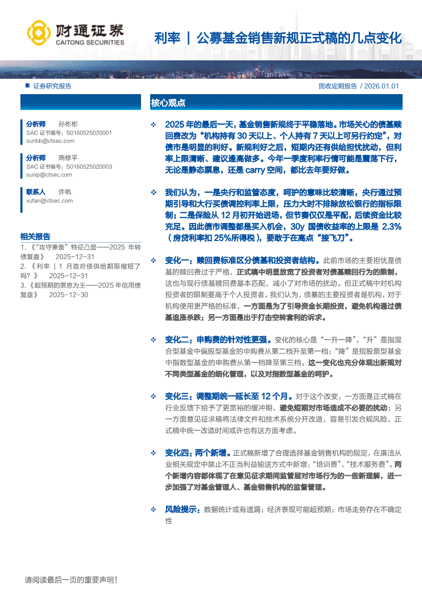 财通证券-利率|公募基金销售新规正式稿的几点变化-260101
