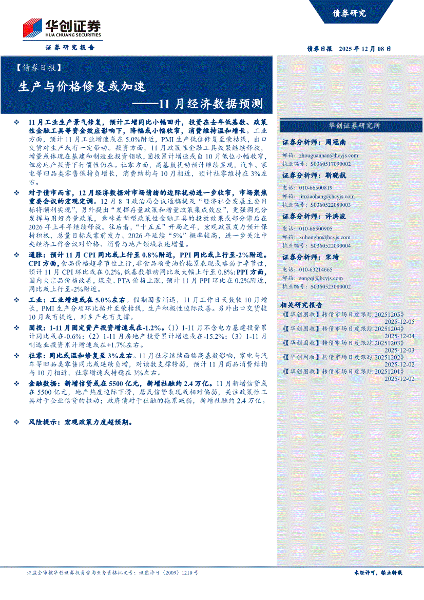华创证券-【债券日报】11月经济数据预测:生产与价格修复或加速-251208
