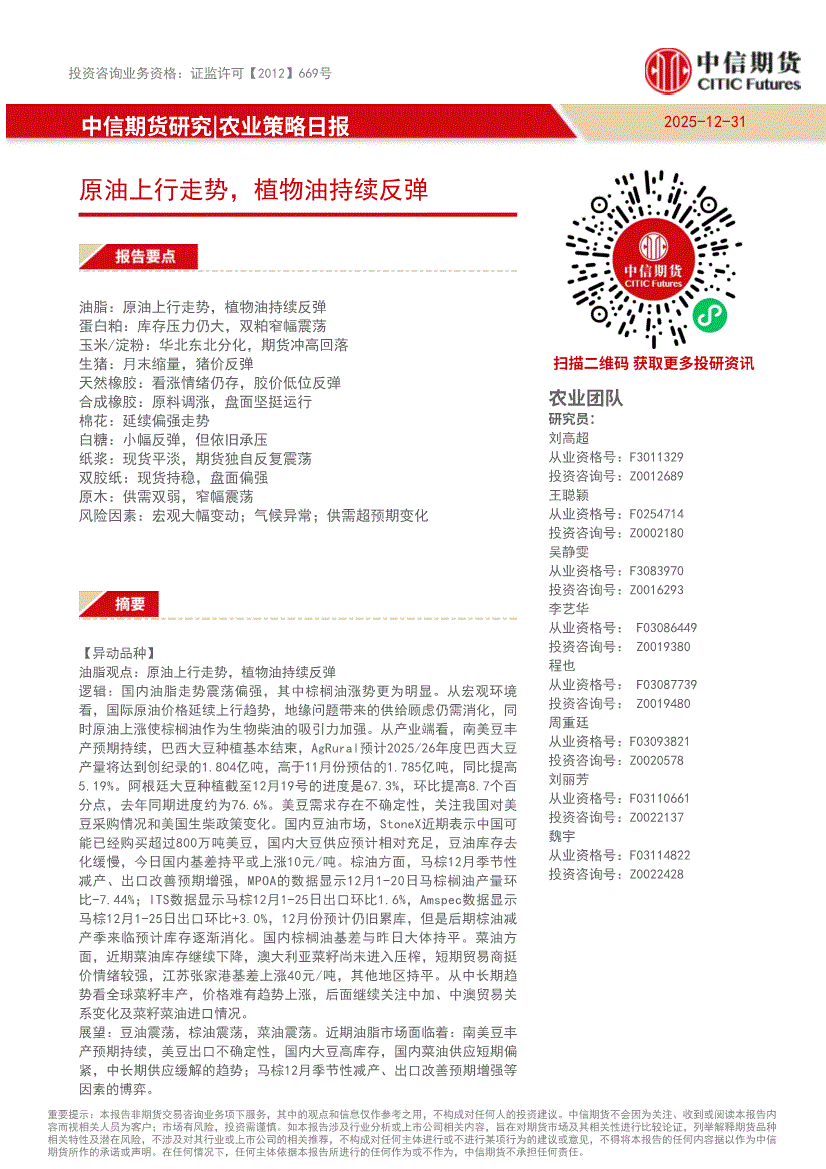 中信期货-农业策略日报:原油上行走势,植物油持续反弹-251231