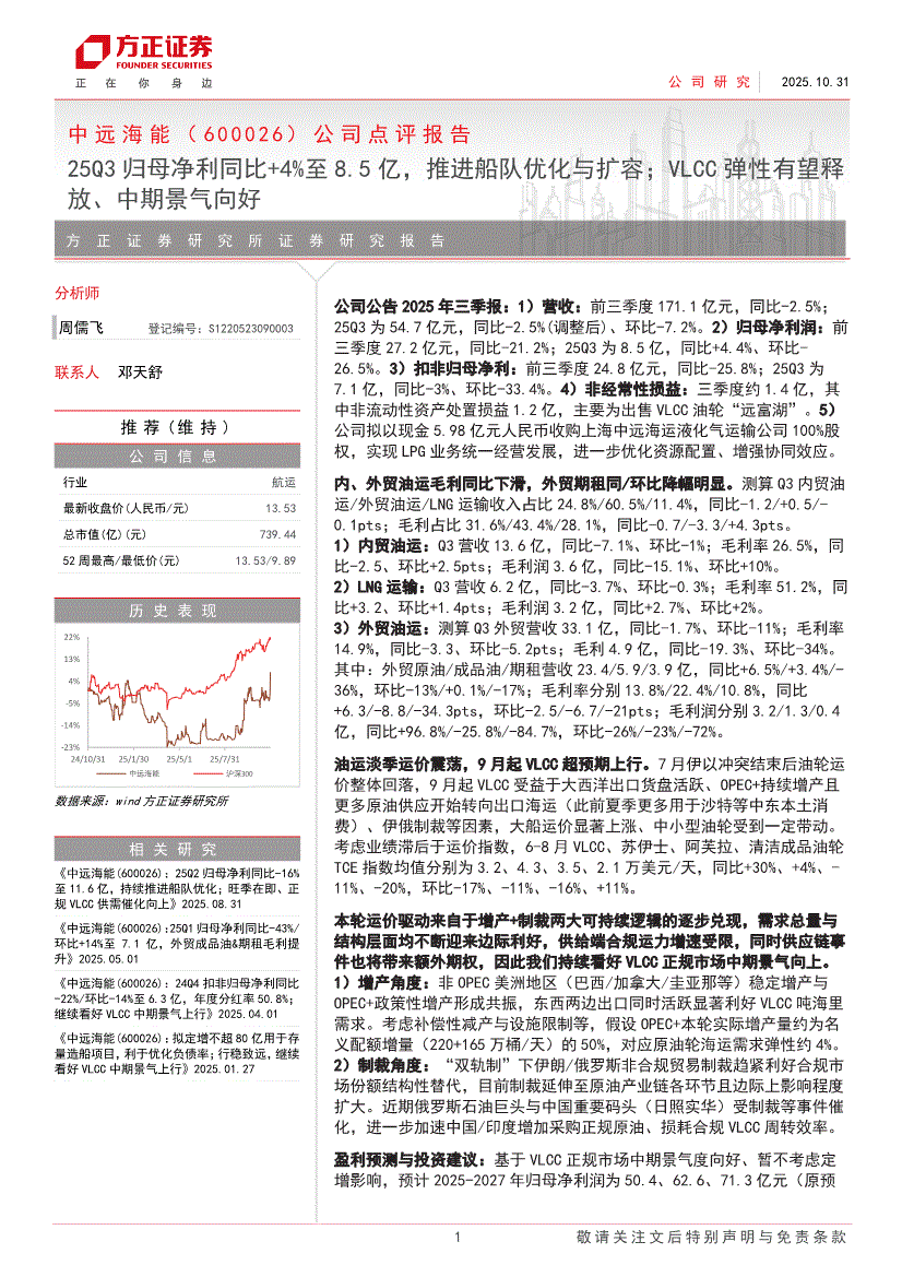 中远海能:方正证券-中远海能-600026-公司点评报告:25Q3归母净利同比+4%至8.5亿,推进船队优化与扩容;VLCC弹性有望释放、中期景气向好-251031