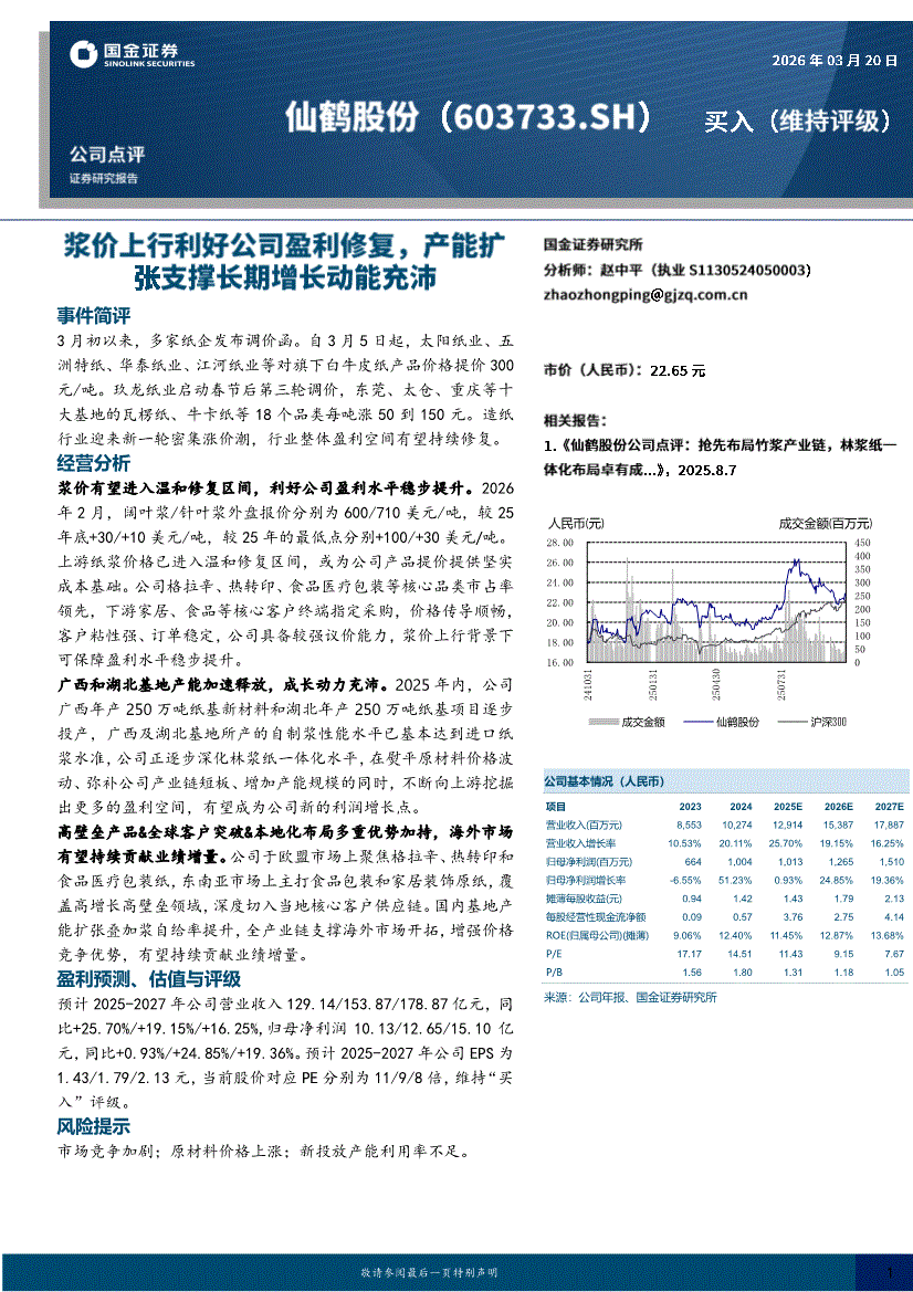 仙鹤股份:国金证券-仙鹤股份-603733-浆价上行利好公司盈利修复,产能扩张支撑长期增长动能充沛-260320