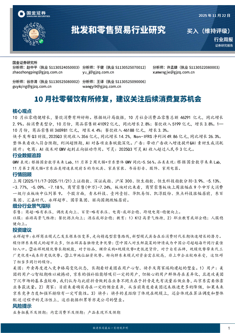 批发和零售贸易行业:国金证券-批发和零售贸易行业周报:10月社零餐饮有所修复,建议关注后续消费复苏机会-251122