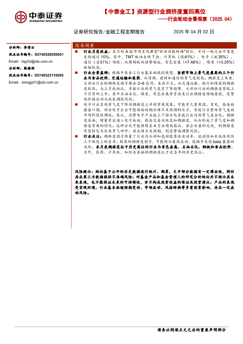 中泰证券-行业轮动全景观察(2025.04):资源型行业拥挤度重回高位-250402