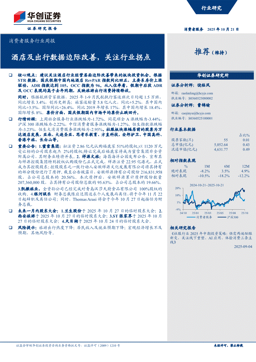 消费者服务行业:华创证券-消费者服务行业周报:酒店及出行数据边际改善,关注行业拐点-251021