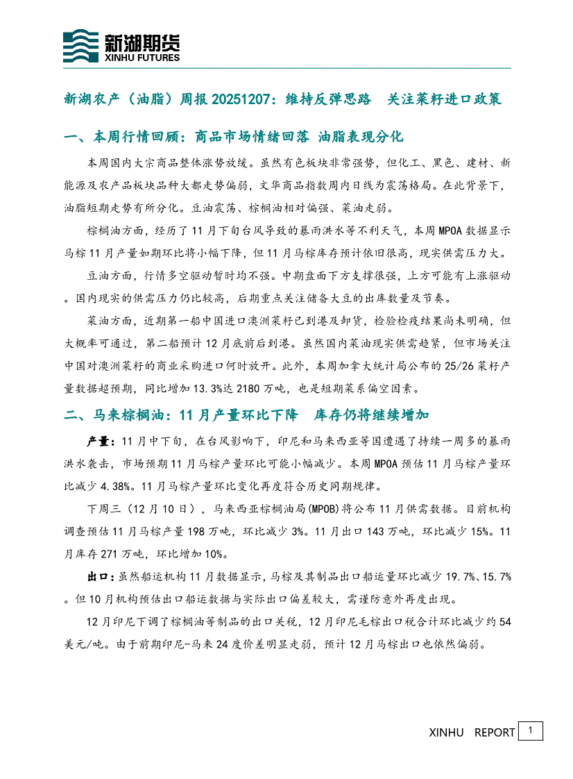 新湖期货-农产(油脂)周报:维持反弹思路,关注菜籽进口政策-251207