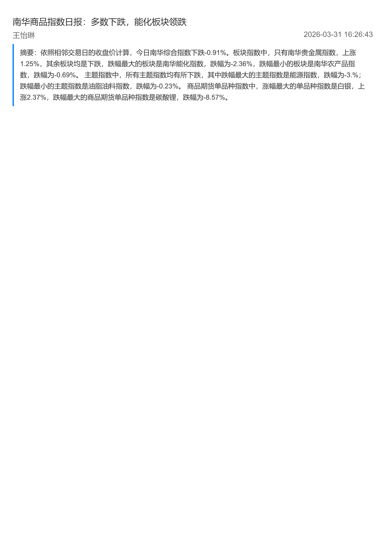 南华期货-商品指数日报:多数下跌,能化板块领跌-260331