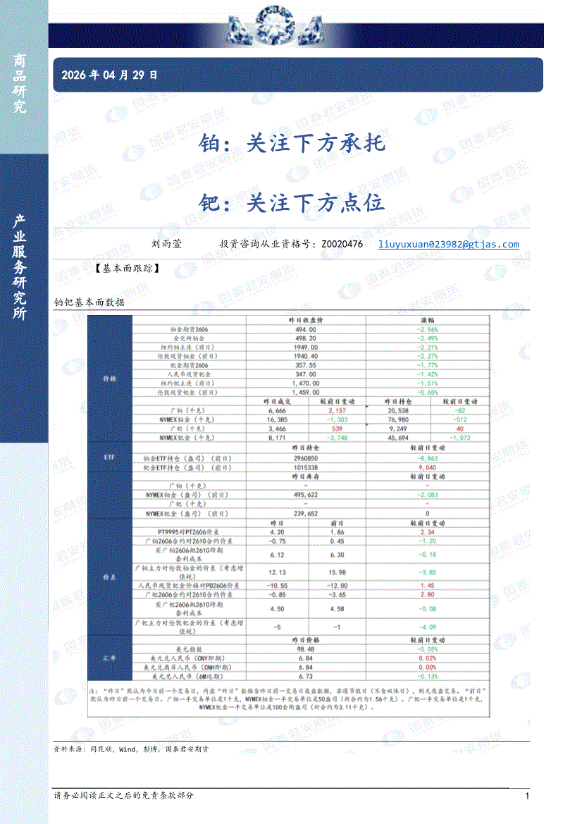 国泰君安期货-铂:关注下方承托,钯,关注下方点位-260429