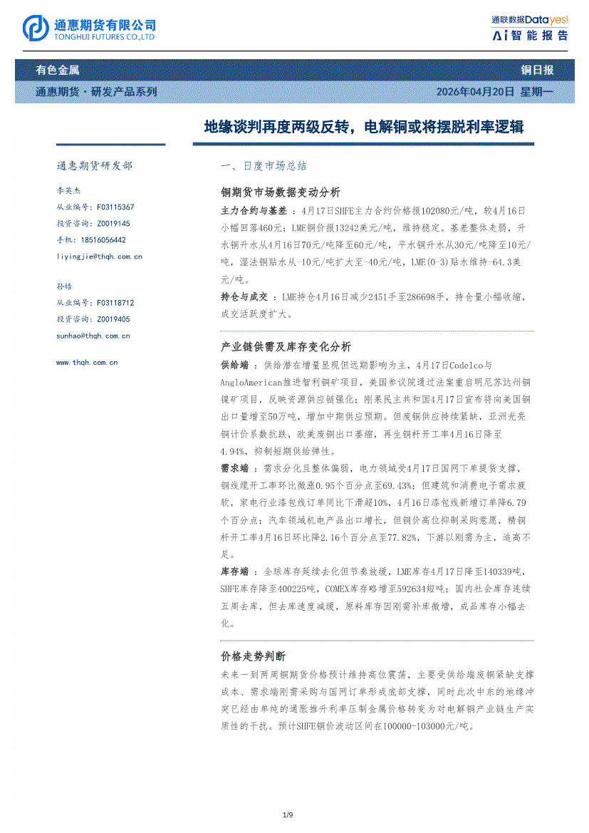 通惠期货-铜日报:地缘谈判再度两级反转,电解铜或将摆脱利率逻辑-260420
