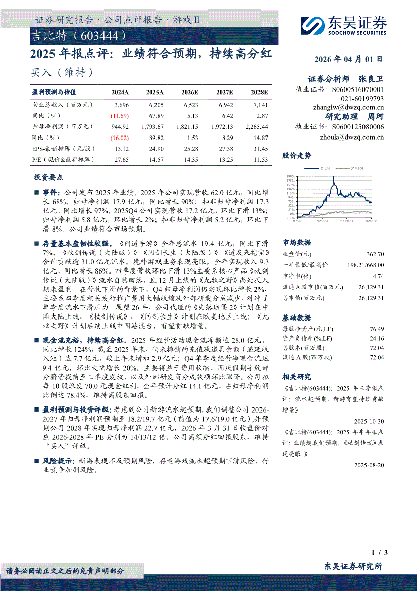 吉比特:东吴证券-吉比特-603444-2025年报点评:业绩符合预期,持续高分红-260401