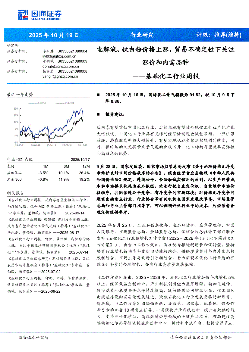 基础化工行业:国海证券-基础化工行业周报:电解液、钛白粉价格上涨,贸易不确定性下关注涨价和内需品种-251019