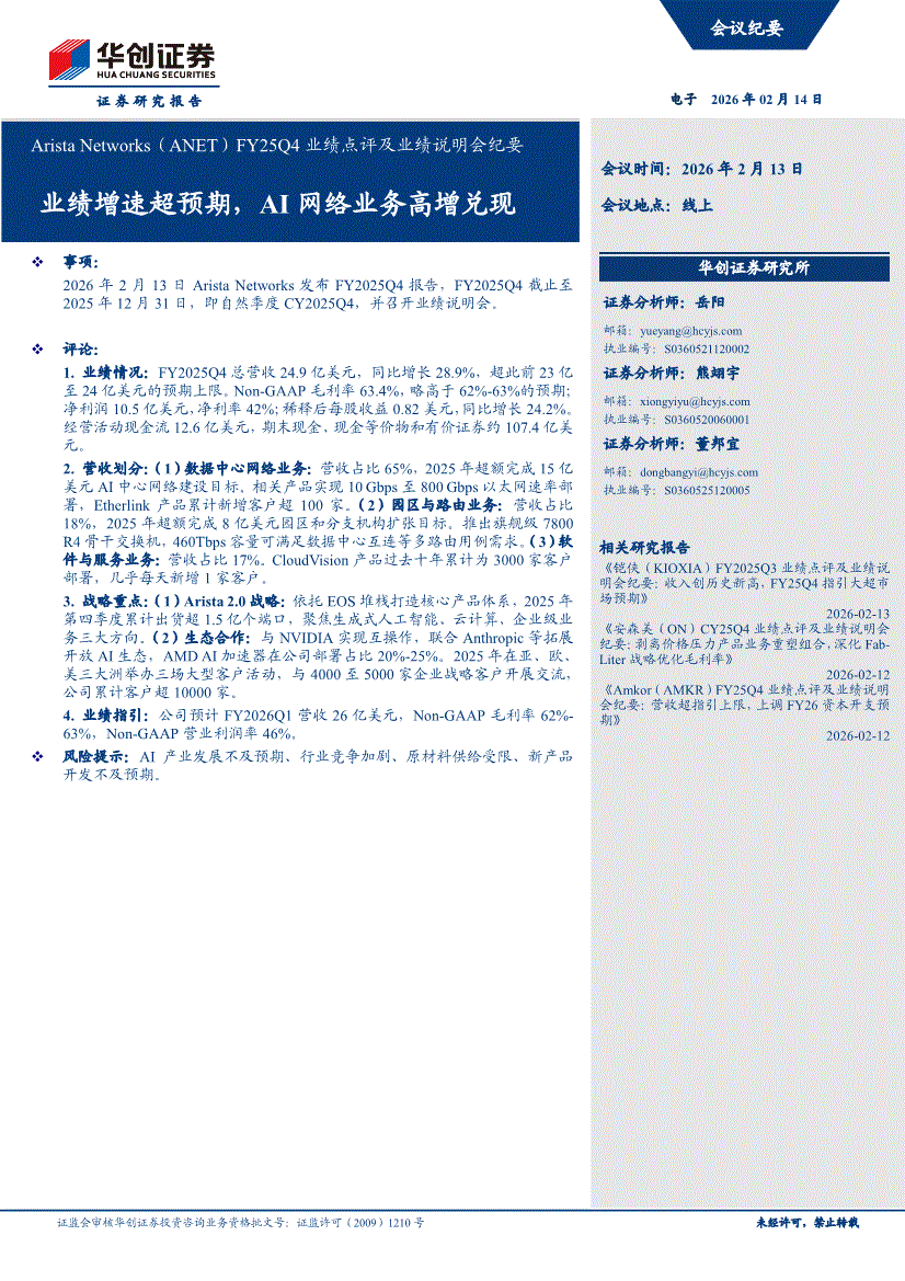 Arista Networks:华创证券-Arista Networks-ANET.US-FY25Q4业绩点评及业绩说明会纪要:业绩增速超预期,AI网络业务高增兑现-260214
