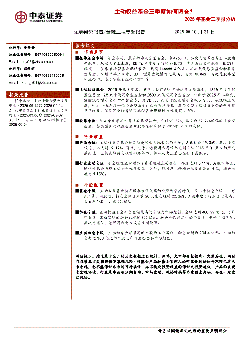 中泰证券-2025年基金三季报分析:主动权益基金三季度如何调仓?-251031