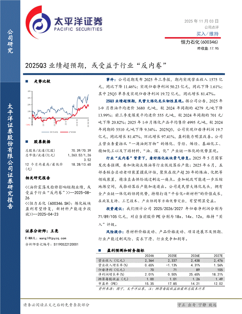 恒力石化:太平洋证券-恒力石化-600346-2025Q3业绩超预期,或受益于行业“反内卷”-251103