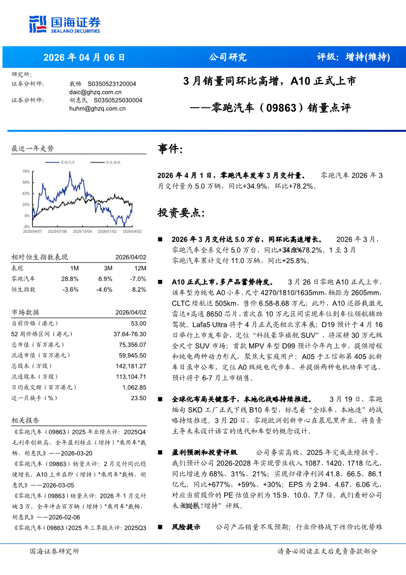 零跑汽车:国海证券-零跑汽车-9863.HK-销量点评:3月销量同环比高增,A10正式上市-260406