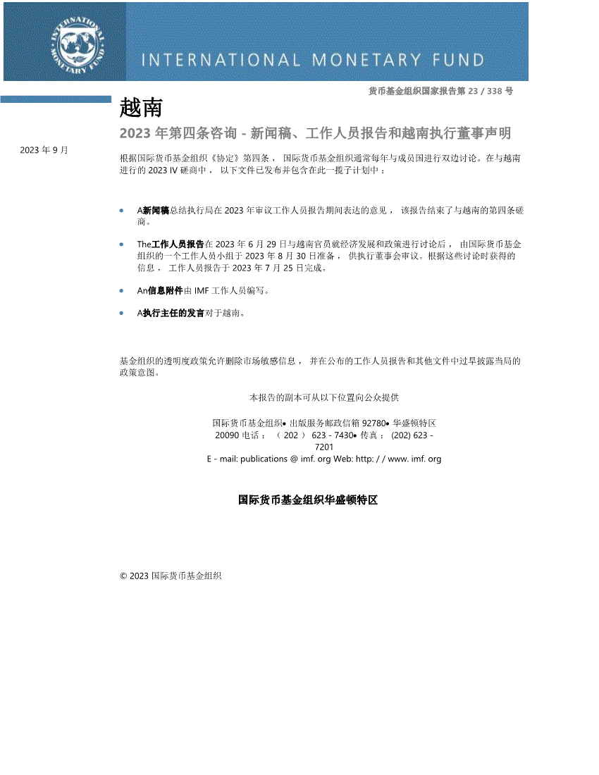IMF-越南:2023 IV磋商~新闻稿;工作人员报告;和越南执行主任的声明(英译中)-230928